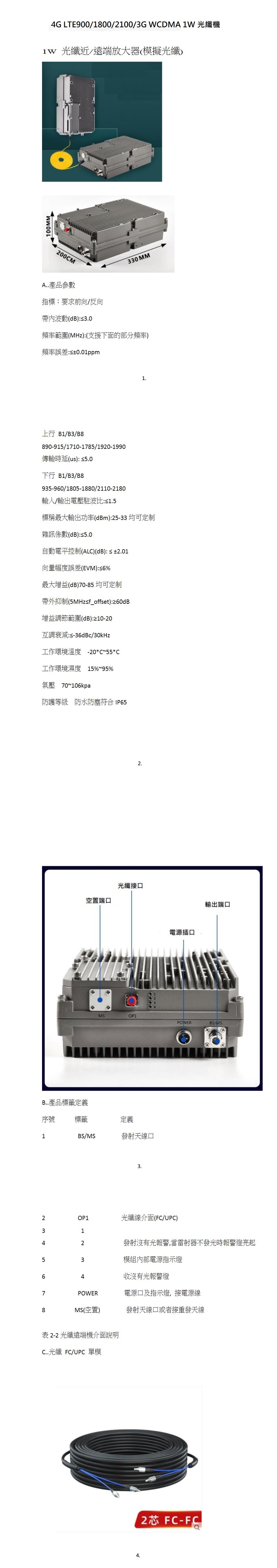 4G LTE900/1800/2100 3G 出力1瓦 光纖機
