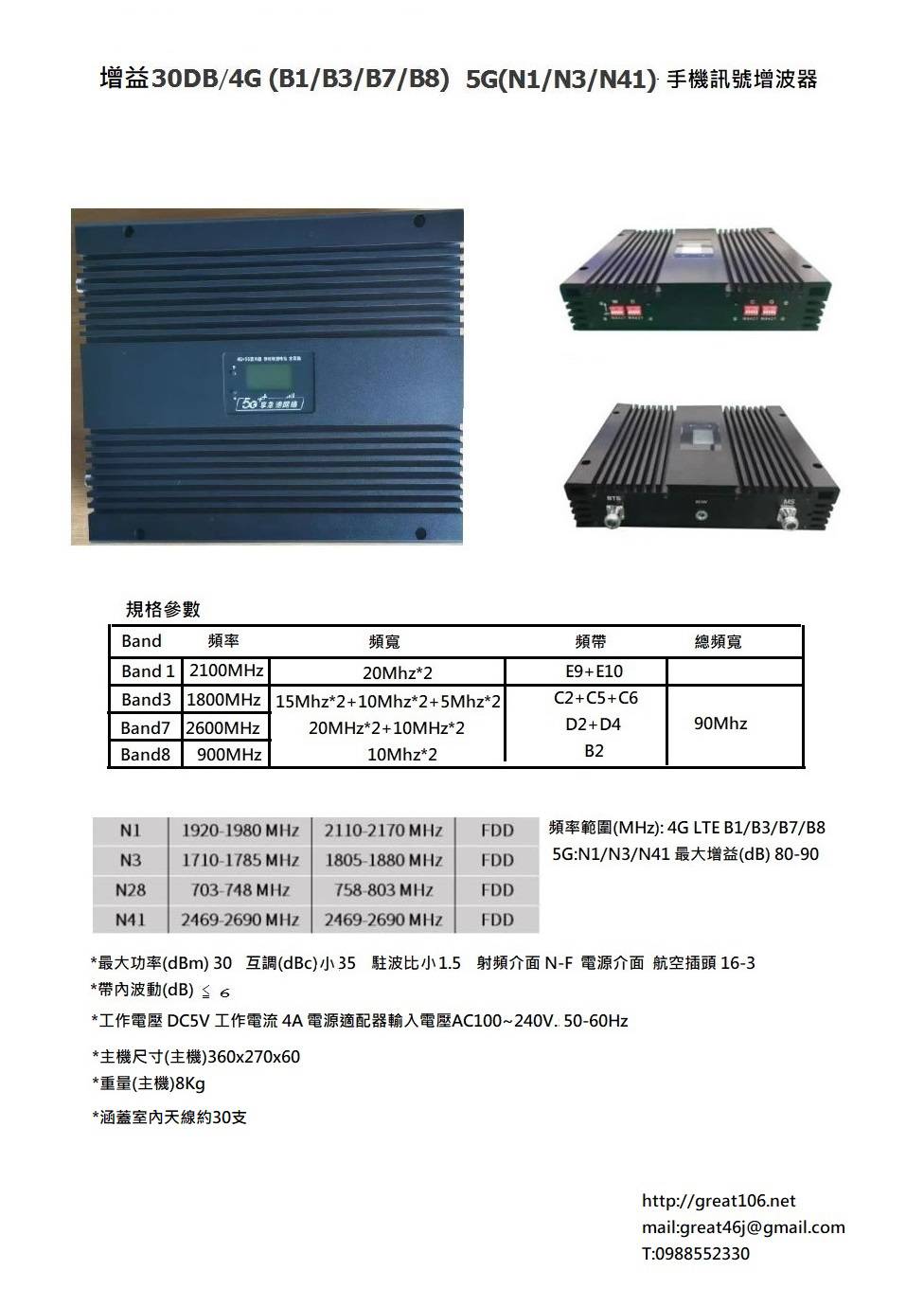 增益30DB/4G(B1/B3/B7/B8) 5G(N1/N3/N41) 手機訊號增波器